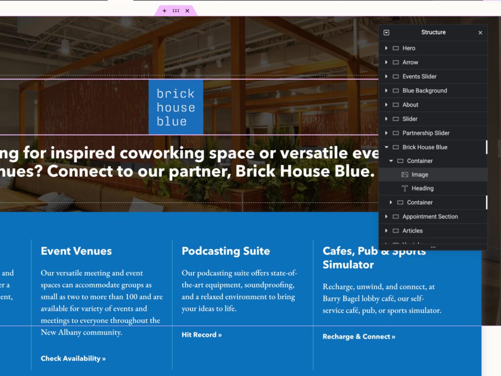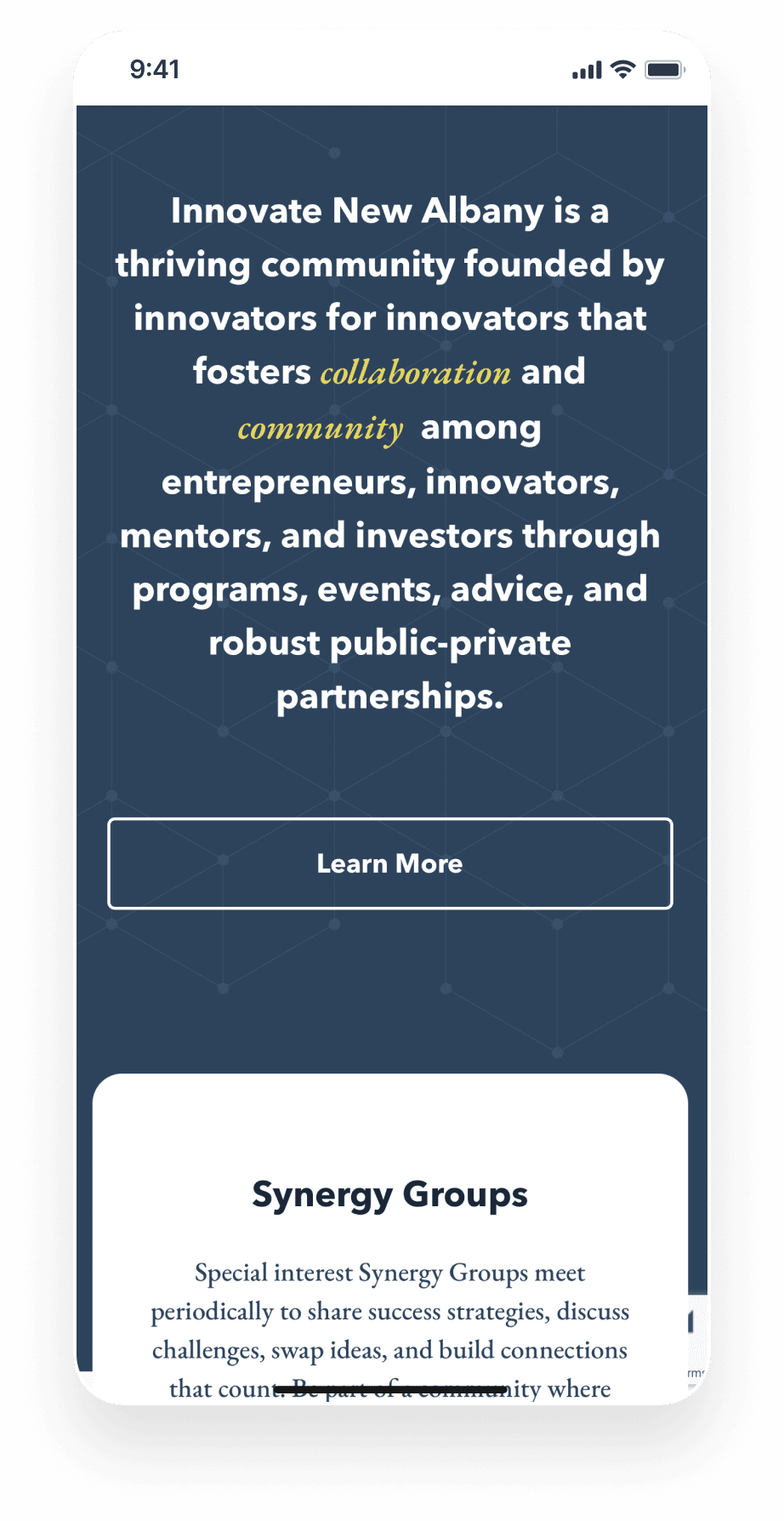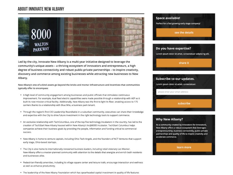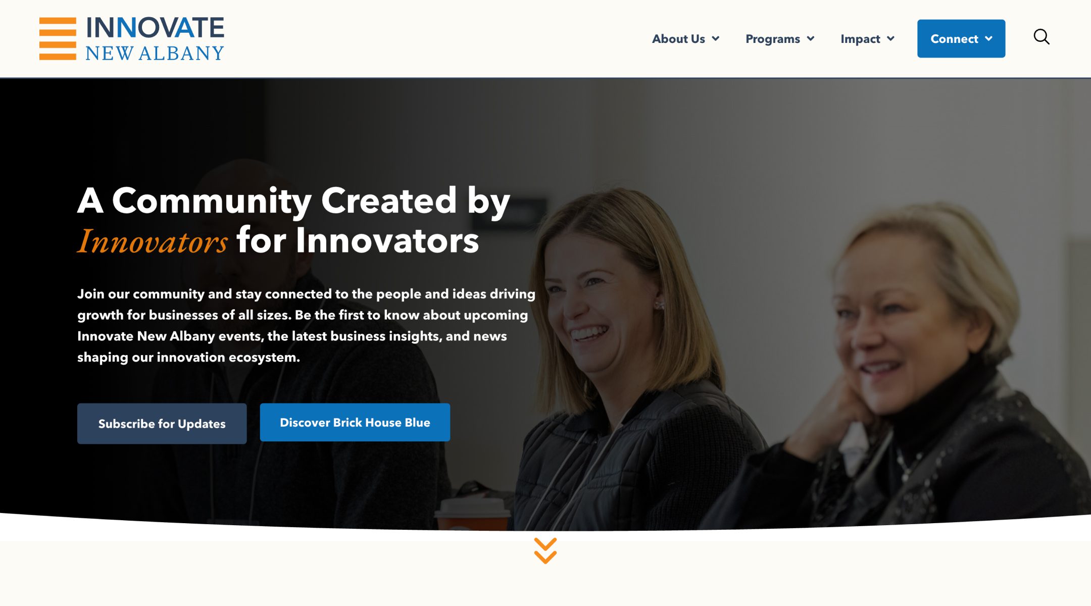 Innovate New Albany wanted to redesign their website to match their updated branding and highlight their new partnership with Brick House Blue. The original site was more than 10 years old and didn’t reflect the wide ranges of services available. -The INA team needed a modern site that would allow them to quickly and easily update content for events and workshops while improving the event registration process. They sought greater visibility for sponsors and partners. Overall, Innovate New Albany wanted to ensure the site felt fresh, innovative, and accessible for users.